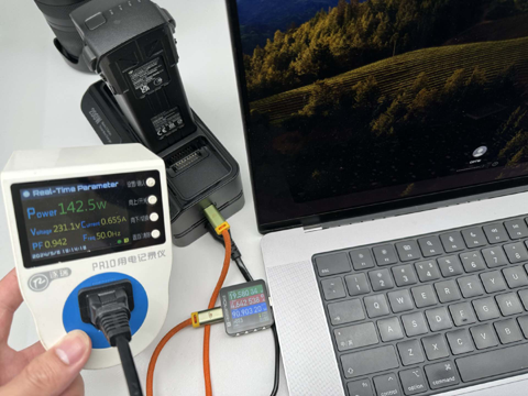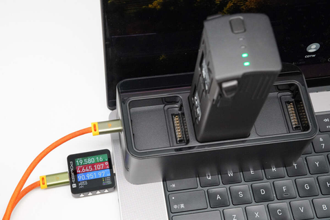 In the same scenario, if only one Mavic 3 battery is charged, the Type-C interface can support an output of about 100W at this time. The current input power measured by the POWER-Z KM003C tester is 19.58V 4.64A 90.9W, which is 19.58V 4.64A 90.9W for MacBook Pro. Charging laptops and other devices is also stress-free.