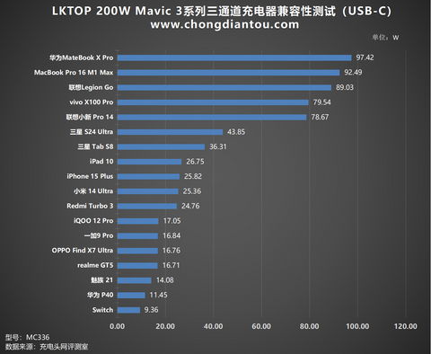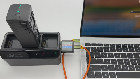 LKTOP 200W Mavic 3 series three-channel charger and Mavic 3 series battery charge Huawei MateBook X Pro laptop. The measured power is 19.87V 4.90A 97.42W.