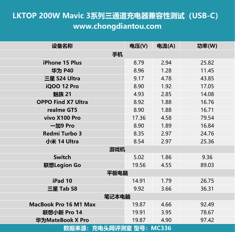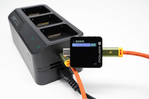 The LKTOP 200W Mavic 3 series three-channel charger also supports USB-C 100W input. The charging head network uses Apple 140W to charge three Mavic 3 series batteries at the same time, and uses POWER-Z KM003C to record the charging curve.