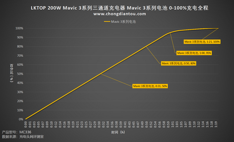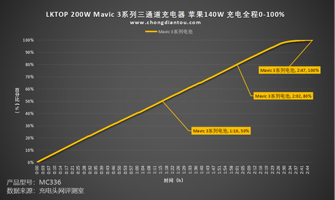 Plotting the charging data into a line chart, it can be seen that using Apple 140W to connect the LKTOP 200W Mavic 3 series three-channel charger C port to charge the Mavic 3 series battery, 50% takes 1 hour and 16 minutes.