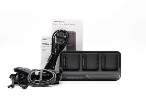 The LKTOP 200W Mavic 3 series three-channel charger supports AC power cord or common charger set input. It is equipped with three battery slots, which can charge three Mavic 3 series batteries at the same time and use the Type-C interface to remote control the Mavic 3. It can charge C devices such as mobile phones; at the same time, it can also be used as a power bank when paired with a Mavic 3 series battery to charge common electronic devices such as mobile phones, tablets, and laptops.