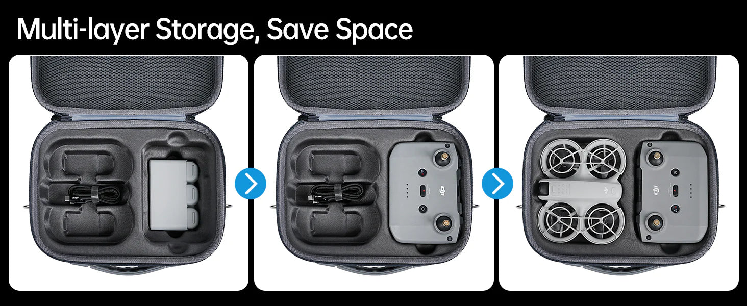 The LKTOP carrying case designed for your DJI NEO drone, precision molded to fit snugly to the drone and its accessories, preventing internal movement and shaking, with dedicated space for your DJI NEO drone and other accessories,this travel case is the ideal companion for you.