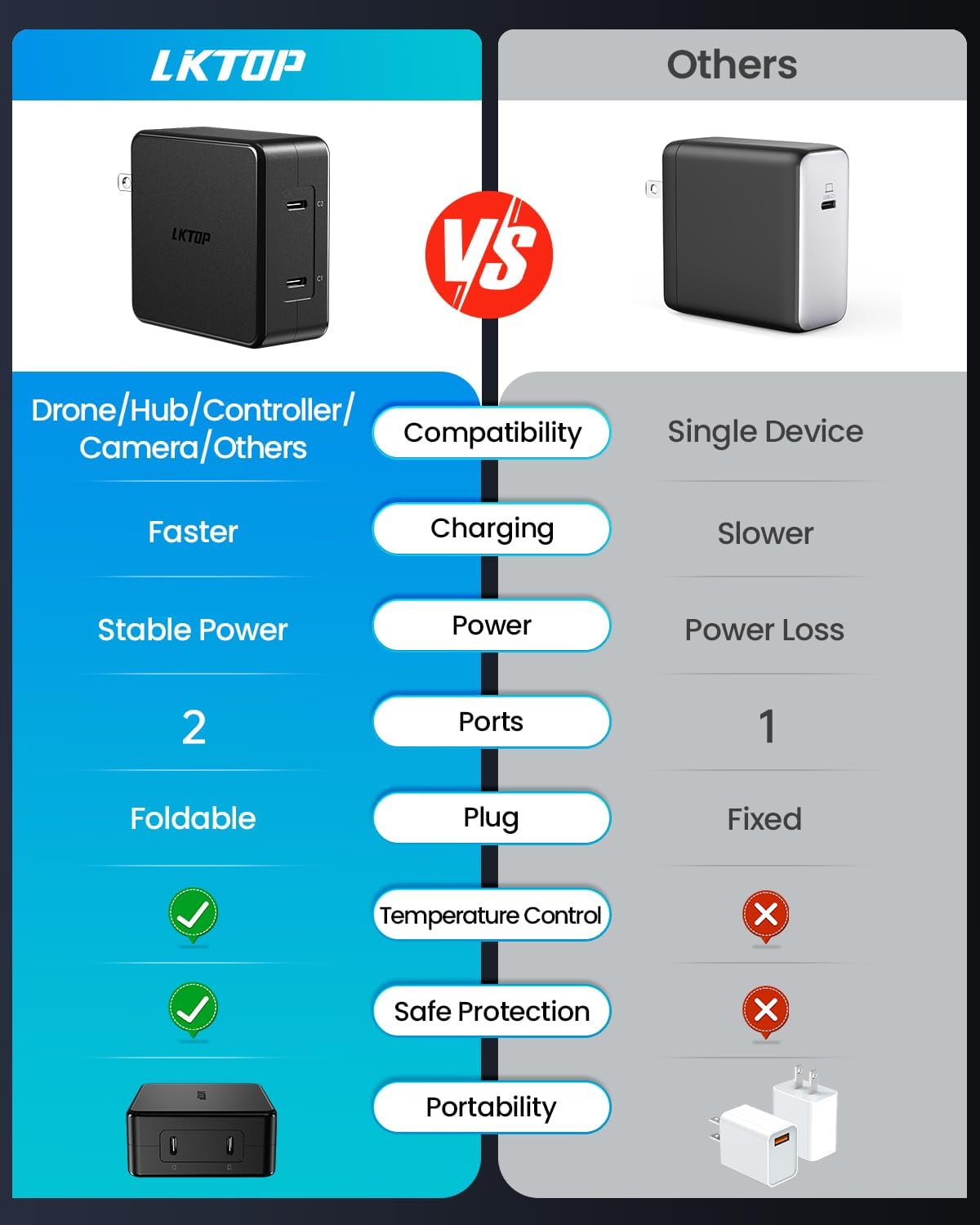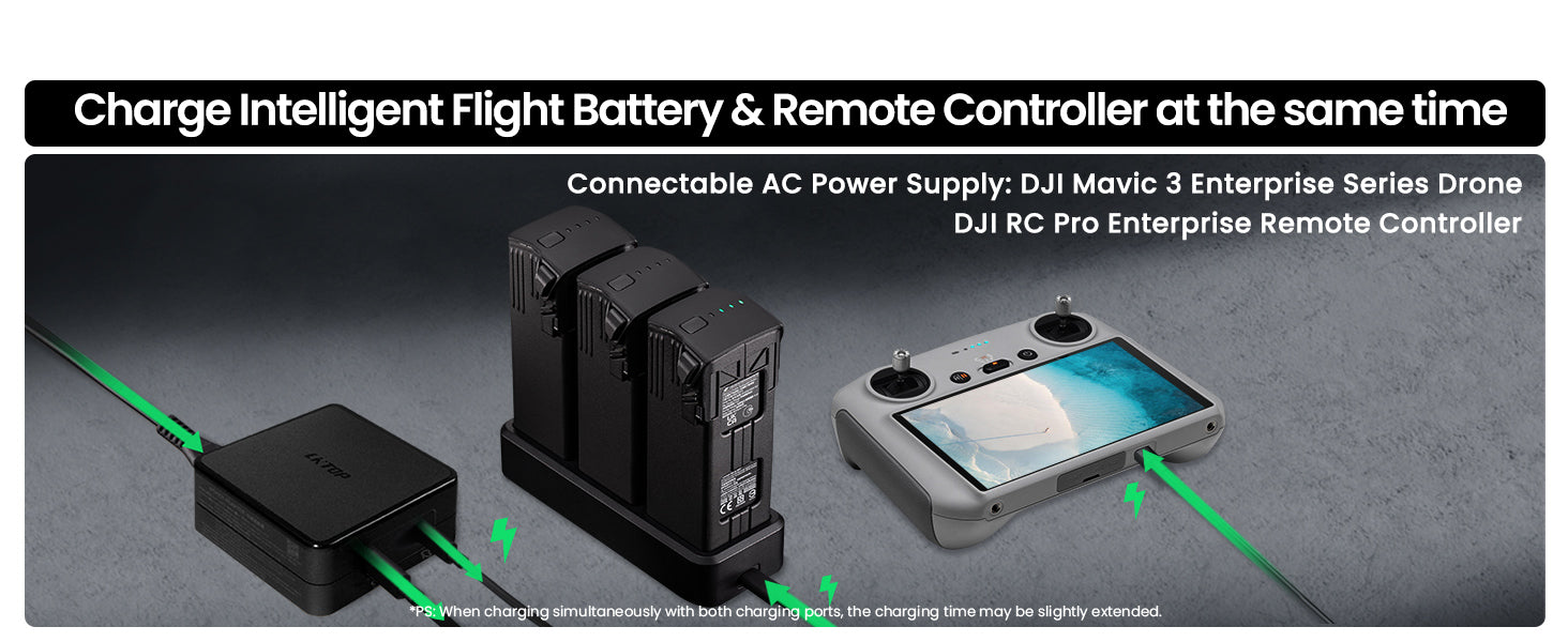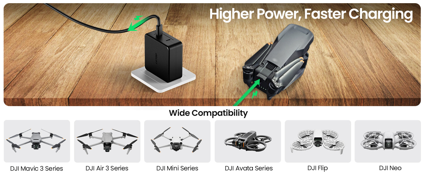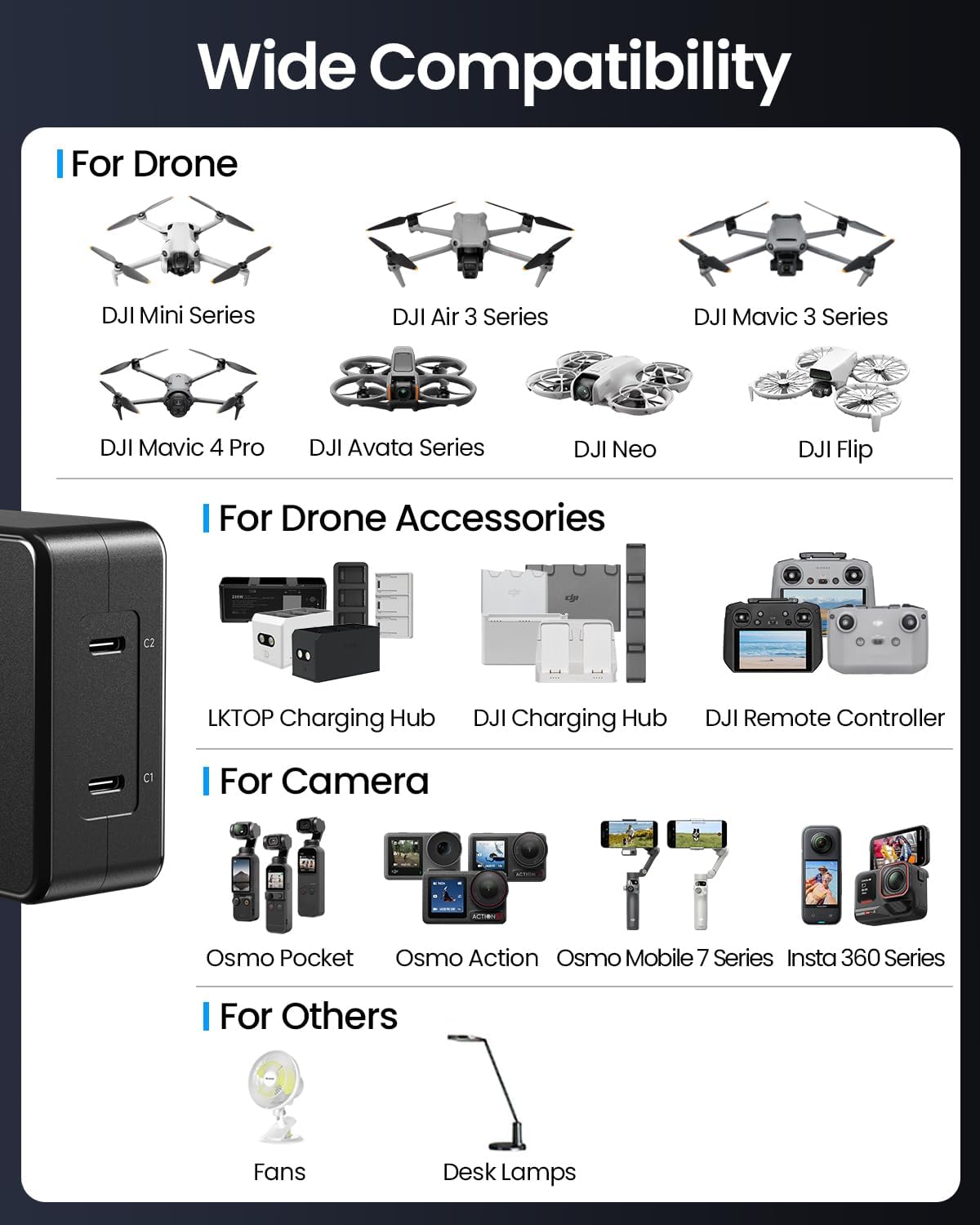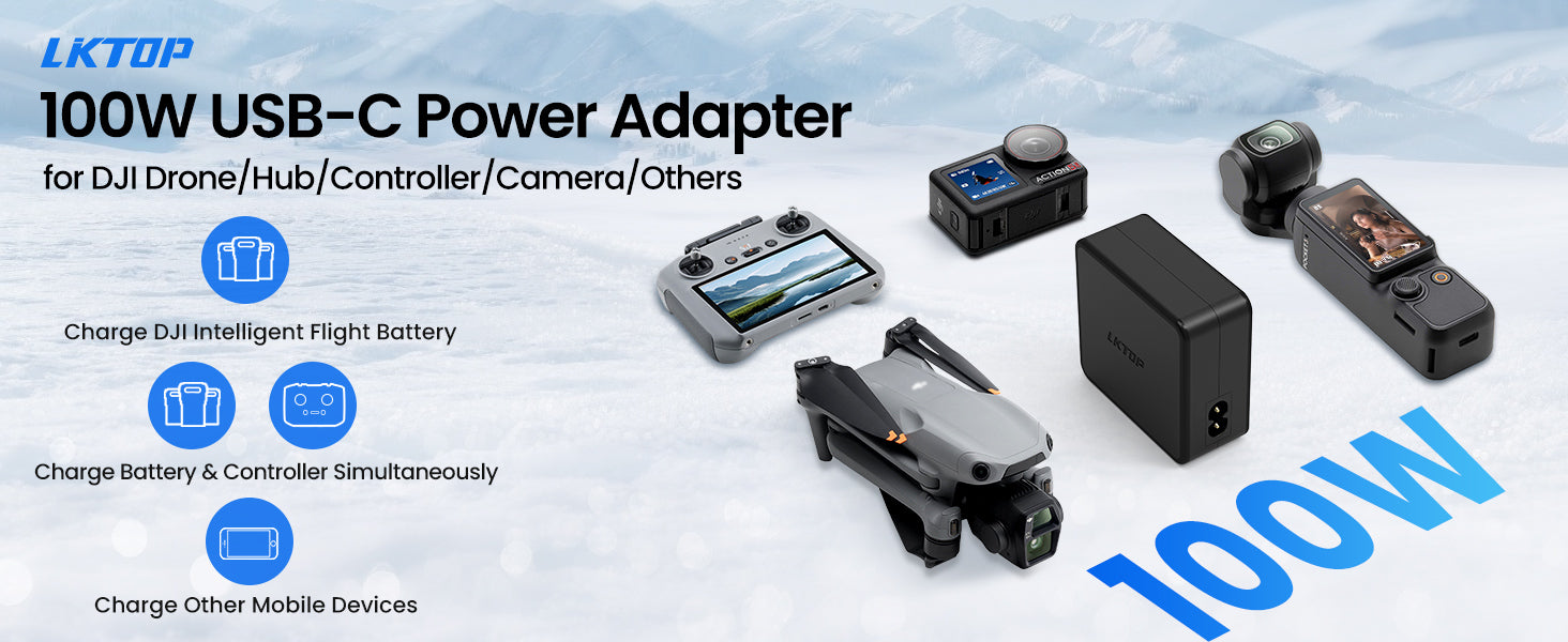 Our 100W USB-C Power Adapter is compatible with a range of DJI products, including the DJI Mini 5 Pro, Mini 4 Pro, Mini 3 Pro, Mini 3, Mini 4K, Mini 2 SE, Mini 2, Mini SE, Mavic Mini, Air 3, Air 3S, Mavic 3 Pro, Mavic 3 Cine, Mavic 3 Classic, Mavic 3, Mavic 3 Enterprise Series, Mavic 4 Pro, Avata/Avata 2, Neo, Flip, Goggles 2 Battery, DJI/LKTOP Mini 5/4/3 Series Charging Hub, DJI/LKTOP Air 3 Series Charging Hub, DJI Mavic 3 Series Charging Hub, DJI/LKTOP Avata 2 Charging Hub, DJI/LKTOP Neo Charging Hub, DJI Flip Charging Hub, DJI Remote Controller, DJI Action Camera and other USB-C port devices.