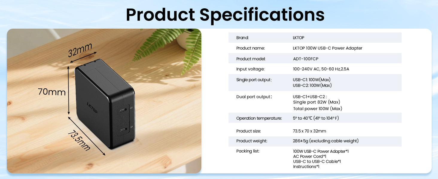 With a design featuring 2 ports, a single USB-C port supports 100W blind insertion, allowing you to charge 2 devices at once. Having 1 charger is like having 2 chargers in one. The 100W fast charger's plug is foldable, making it more portable and easy to store.