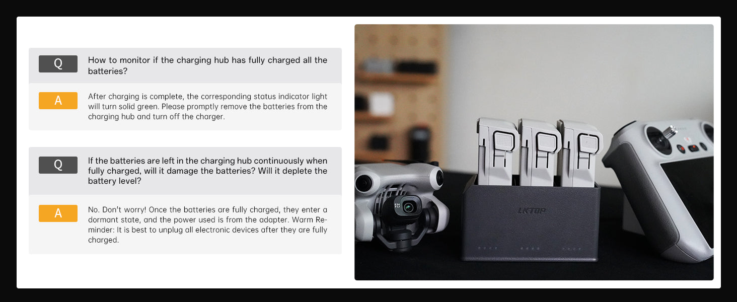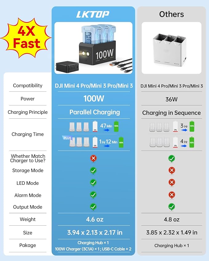 - Smart & Efficient โ True parallel charging, not one-by-one, saves you time and keeps your drone ready to fly.