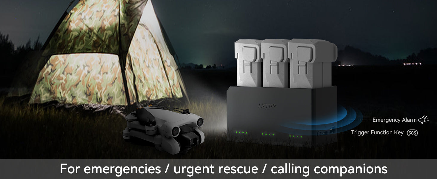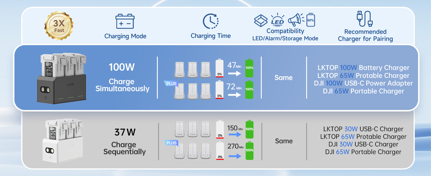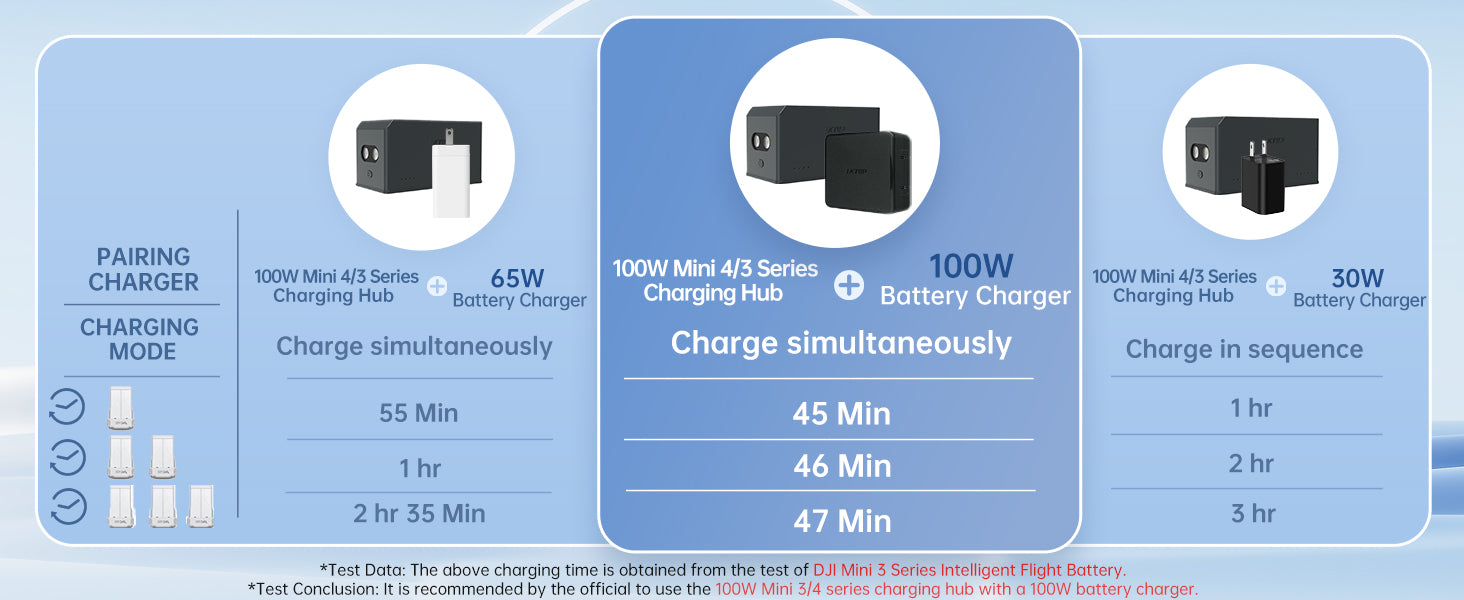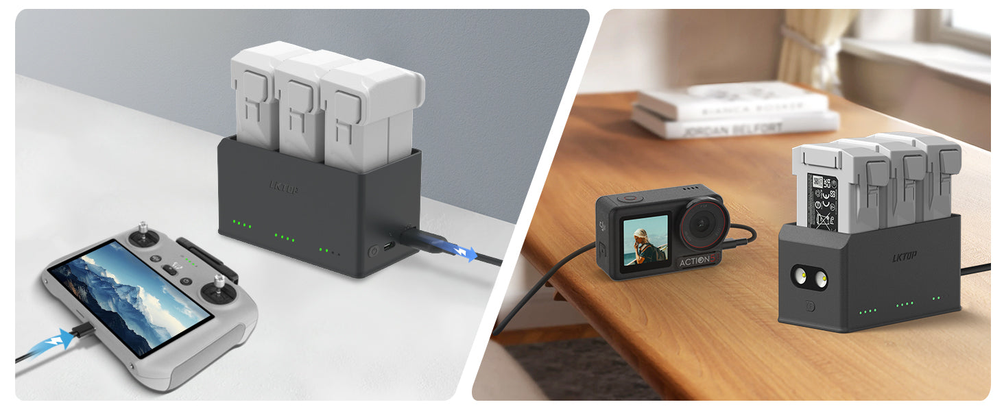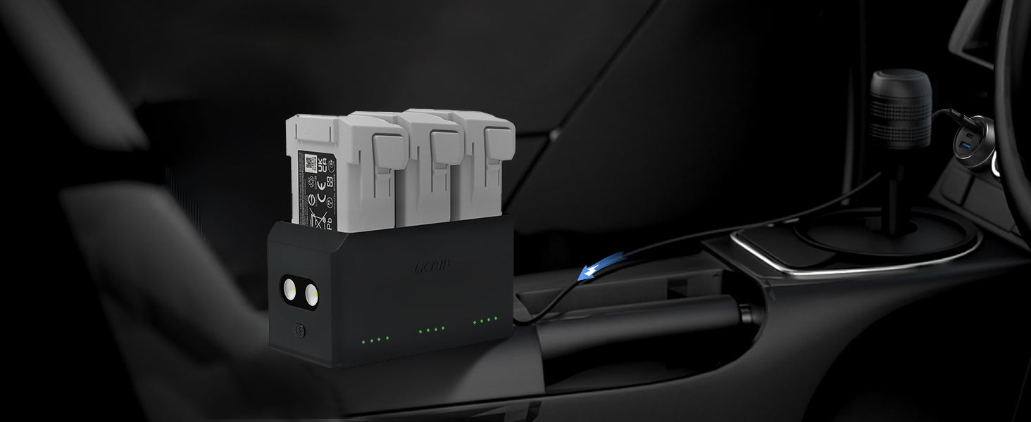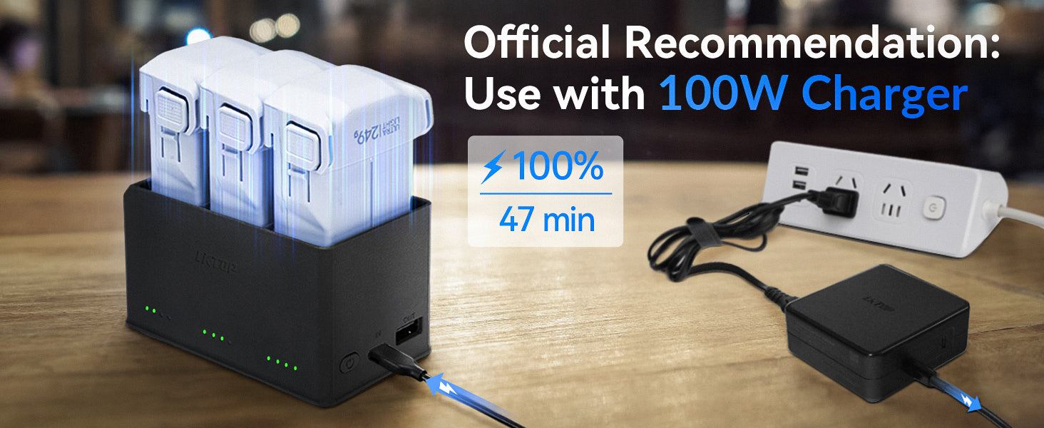 Charge 3 batteries at the same time or simultaneously charge battery and DJI remote controller/camera/Ipad (some other devices with USB-C port) ; Charging Time: 47 min (for 3 Intelligent Flight Battery); 72 min (for 3 Intelligent Flight Battery Plus).