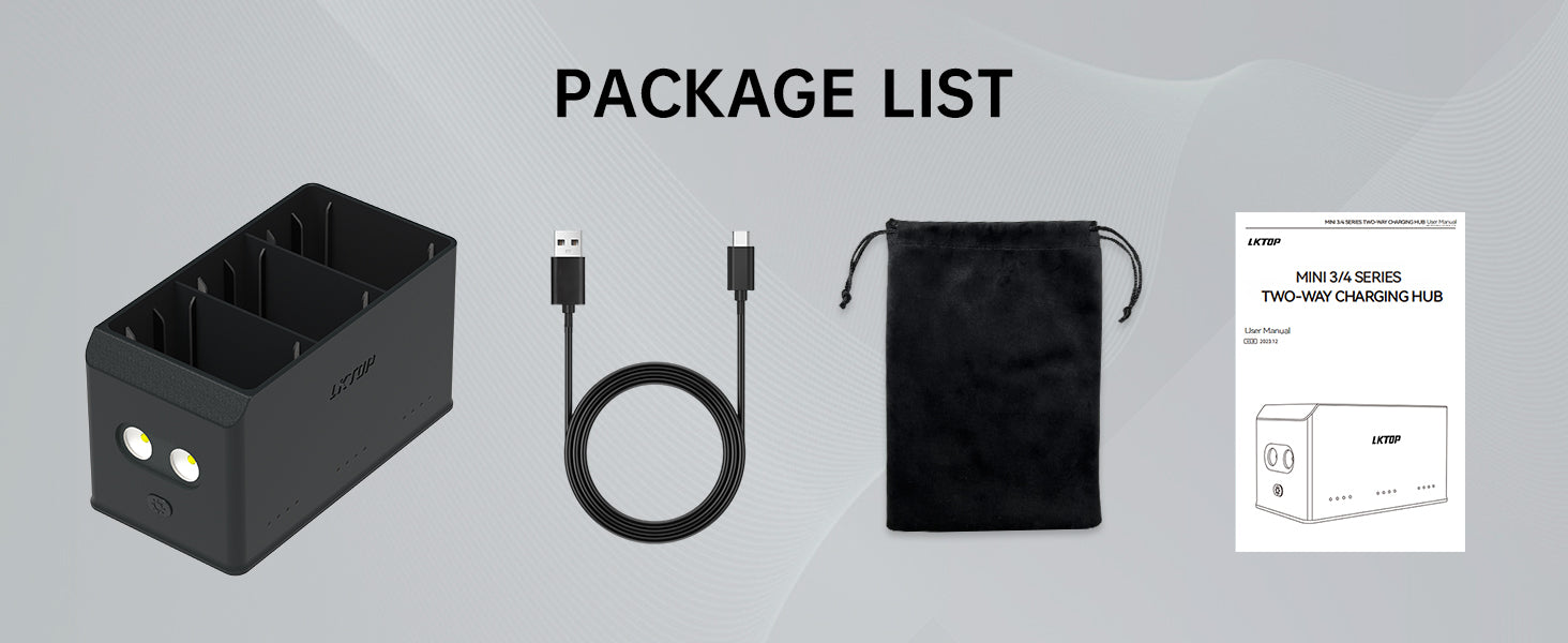 Compatible with DJI Mini 4 Pro, DJI Mini 3 Pro, DJI Mini 3, SKYROVER X1 intelligent flight battery. The package includes one Mini 4 Pro/Mini 3 Series battery charging hub and one USB-C cable.
