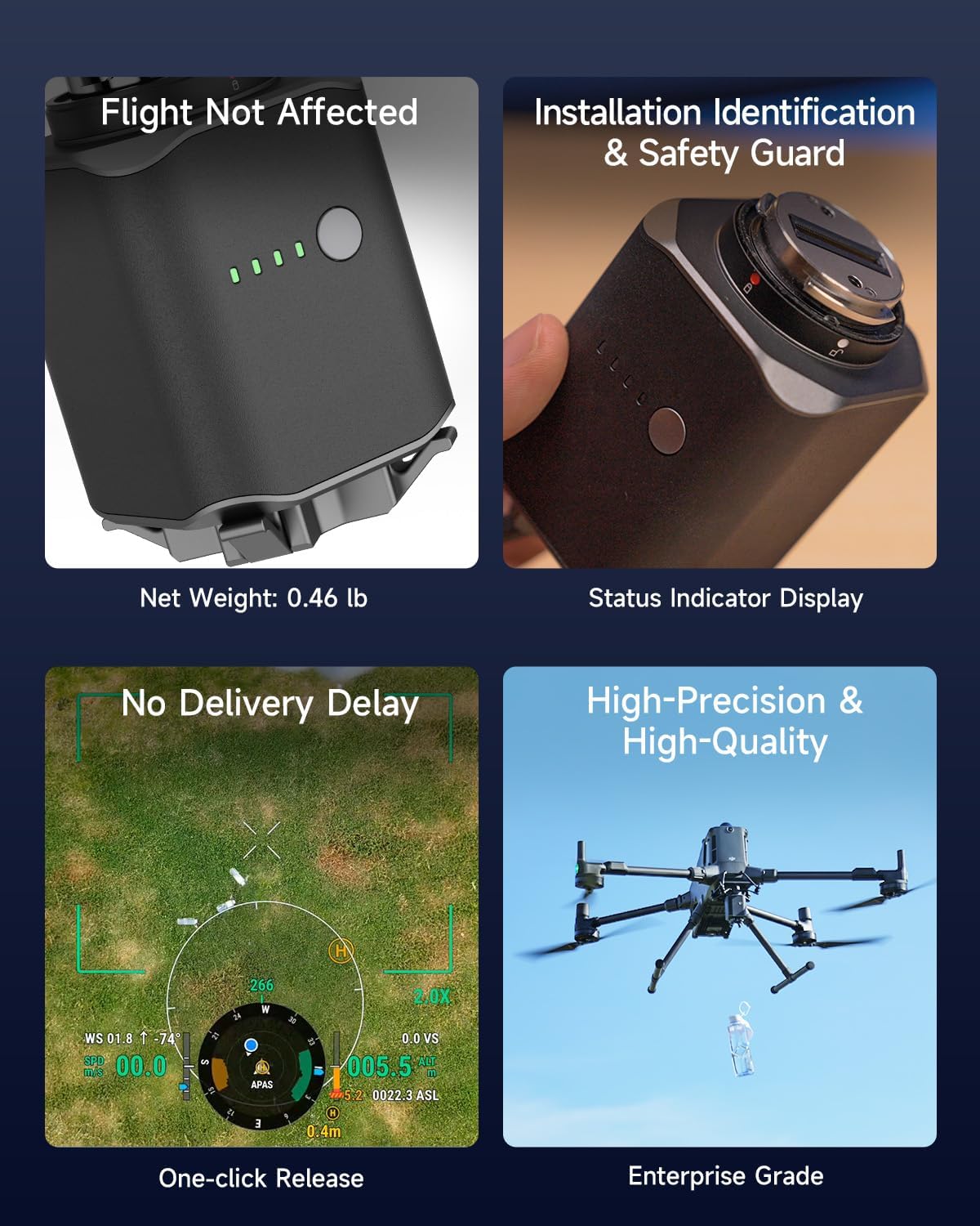 Featuring a unique 4-stage airdrop mechanism, the Fishing Bait Drop Release allows for simultaneous deployment of up to four items. With DJI Pilot 2 control, it supports both sequential and one-button full drops for ultimate convenience and efficiency.