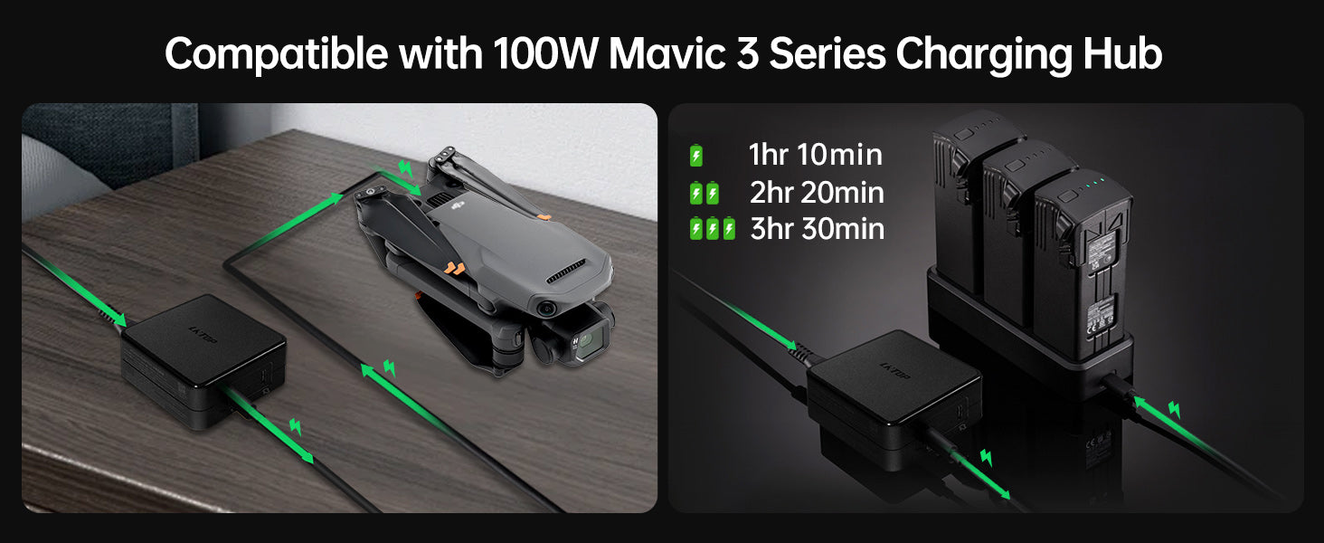 Our 100W USB-C Power Adapter is compatible with a range of DJI products, including the DJI Mini 5 Pro, Mini 4 Pro, Mini 3 Pro, Mini 3, Mini 4K, Mini 2 SE, Mini 2, Mini SE, Mavic Mini, Air 3, Air 3S, Mavic 3 Pro, Mavic 3 Cine, Mavic 3 Classic, Mavic 3, Mavic 3 Enterprise Series, Mavic 4 Pro, Avata/Avata 2, Neo, Flip, Goggles 2 Battery, DJI/LKTOP Mini 5/4/3 Series Charging Hub, DJI/LKTOP Air 3 Series Charging Hub, DJI Mavic 3 Series Charging Hub, DJI/LKTOP Avata 2 Charging Hub, DJI/LKTOP Neo Charging Hub, DJI Flip Charging Hub, DJI Remote Controller, DJI Action Camera and other USB-C port devices.