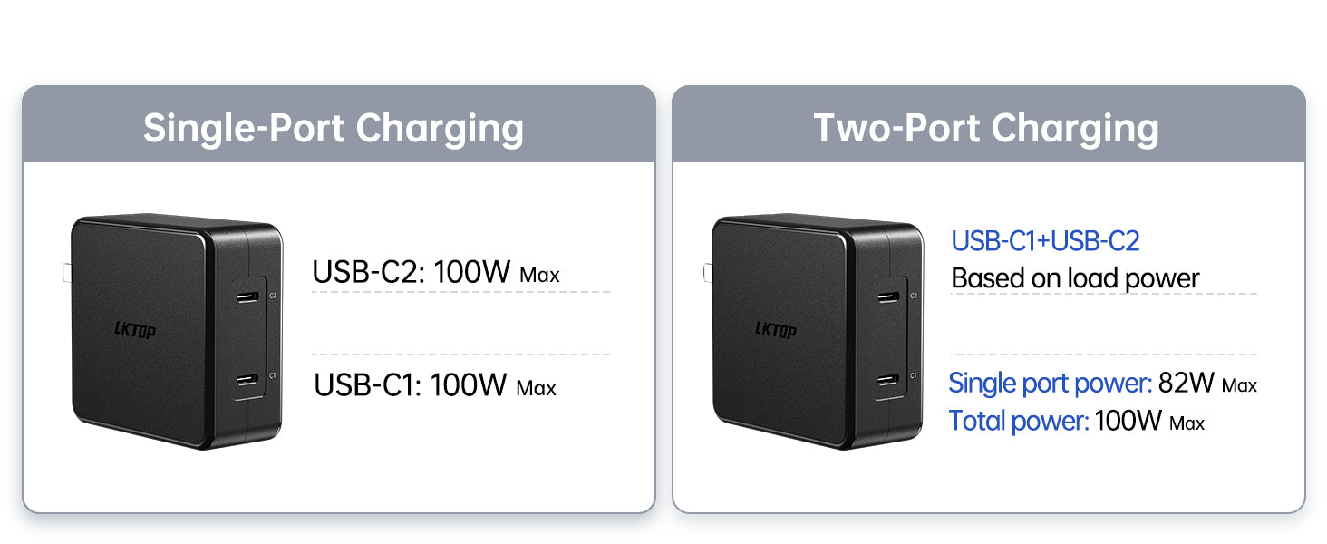 With a design featuring 2 ports, a single USB-C port supports 100W blind insertion, allowing you to charge 2 devices at once. Having 1 charger is like having 2 chargers in one. The 100W fast charger's plug is foldable, making it more portable and easy to store.